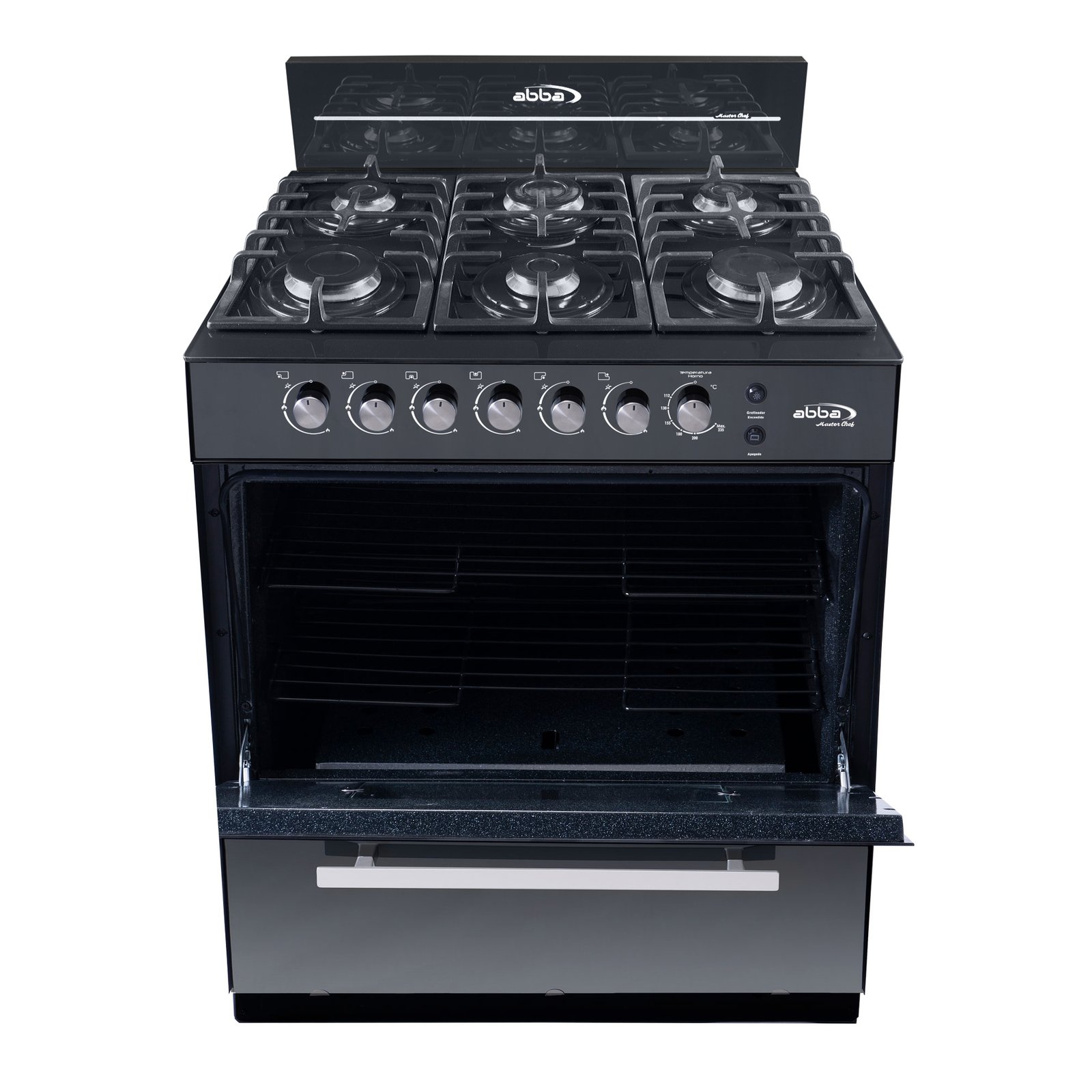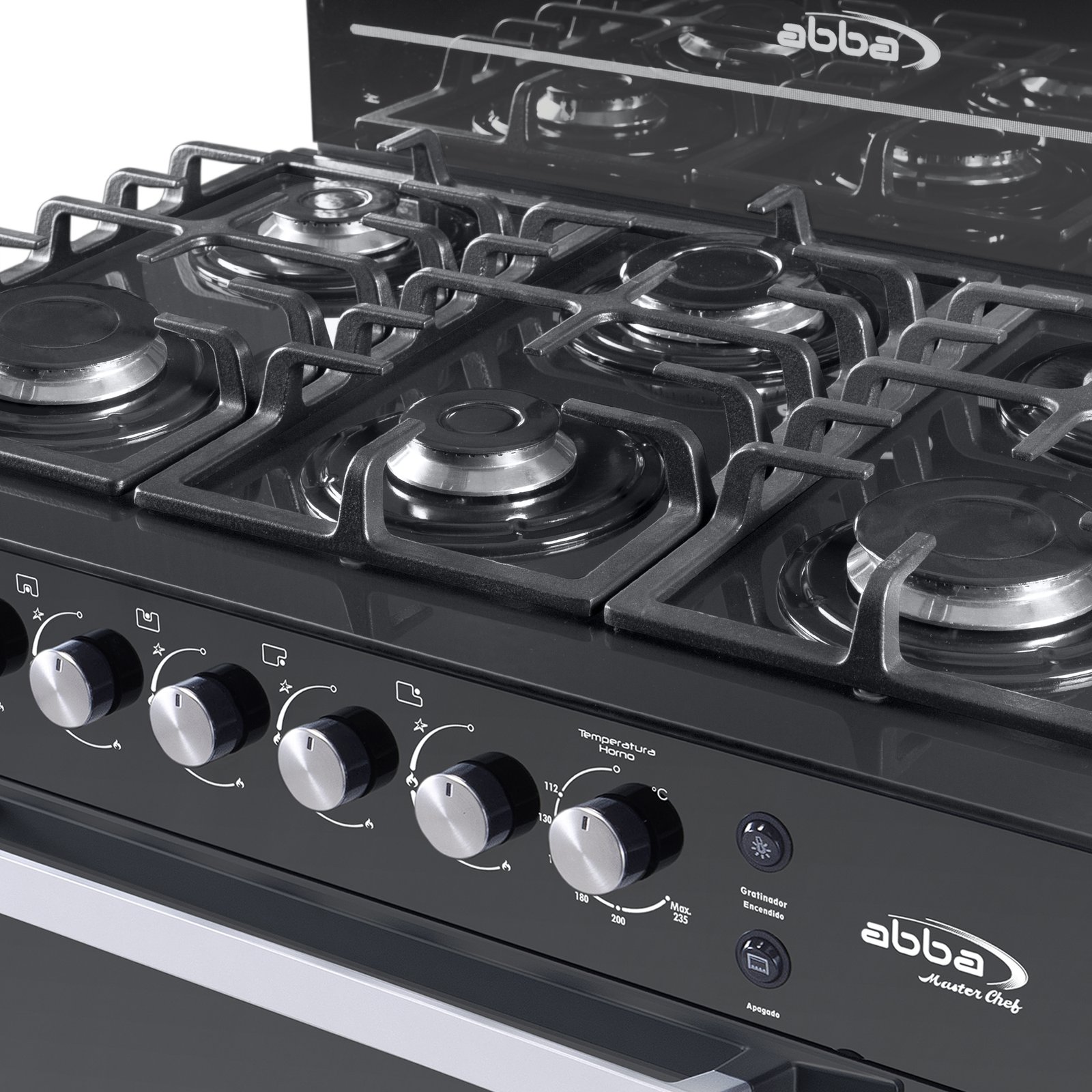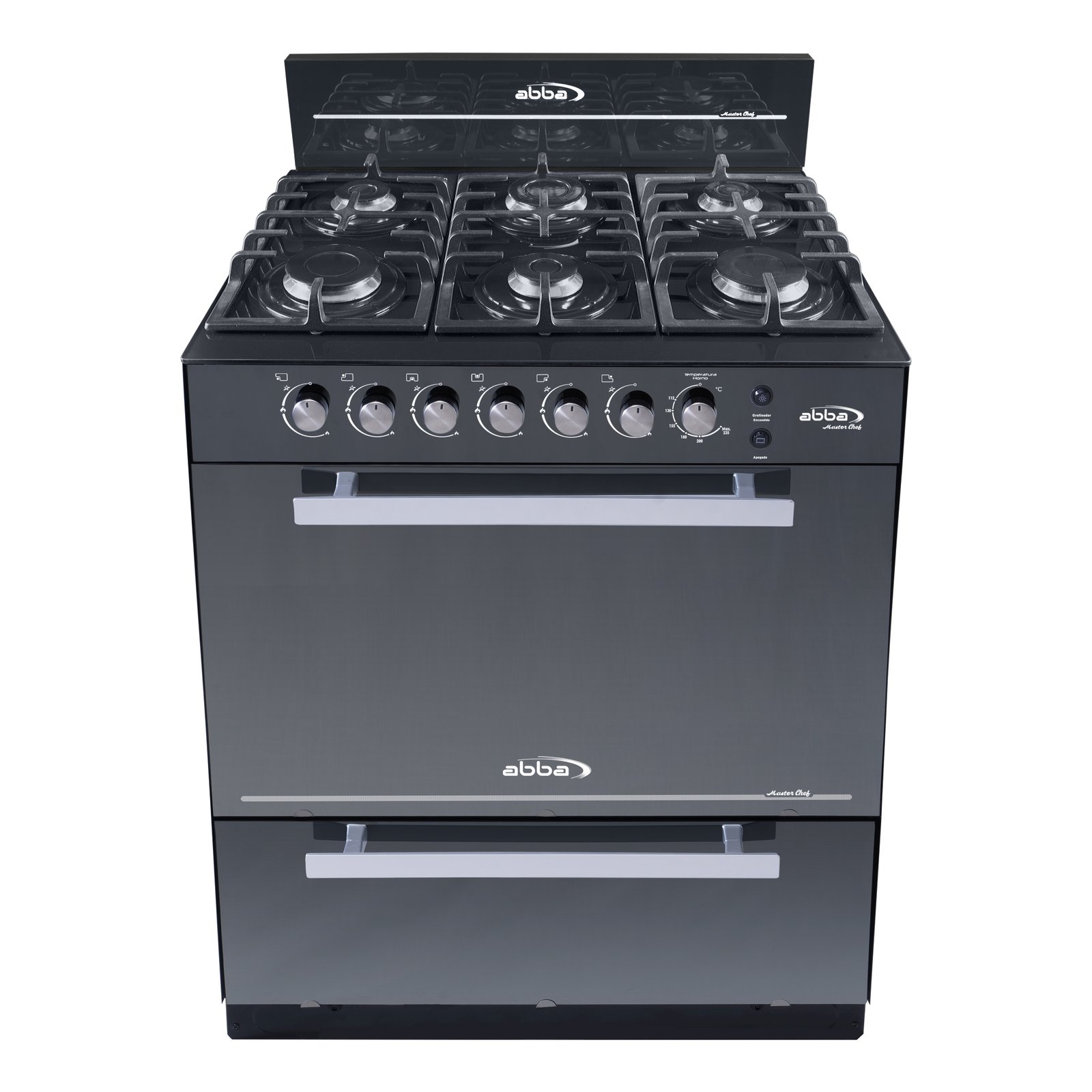 Abba 71 centímetros Gas Natural o propano, puertas y mesa en  vidrio de seguridad, la puerta del horno en vidrio espejo aporta visibilidad al interior  que te permite monitorear tus platillos mientras se cocinan. Dos parrillas superiores dobles en hierro fundido fabricadas con materiales resistentes y fáciles de limpiar con 3 quemadores de alto rendimiento rápidos, 1 quemador ultra rápido perfecta para cocinar con rapidez y precisión. Encendido automático (en quemadores y horno), hornos con aislamiento térmico lo cual evita perdidas de calor al interior del horno, generando menor consumo de energía, espacioso y eficiente, permite hornear con resultados profesionales, operado por termostato (con protección termoeléctrica), con luz interior (bombillo de 25W), gratinador eléctrico de 1000W a 120 V/60 Hz con sensor térmico que evita el sobrecalentamiento del producto, Calientaplatos asador. Perillas de estufa con diseño ergonómico. Manijas, puerta horno y puerta asador con acabados metalizados.