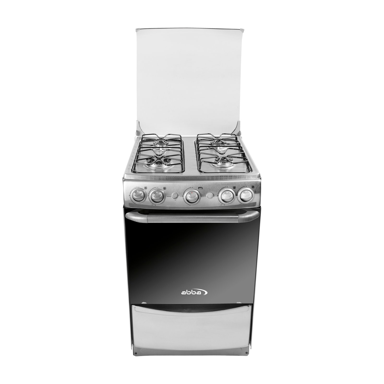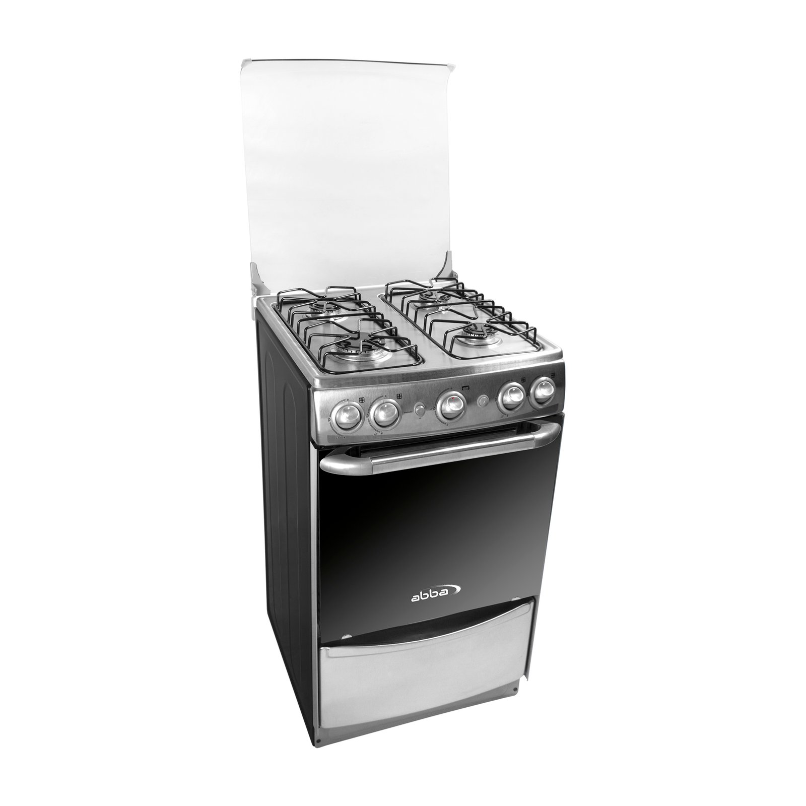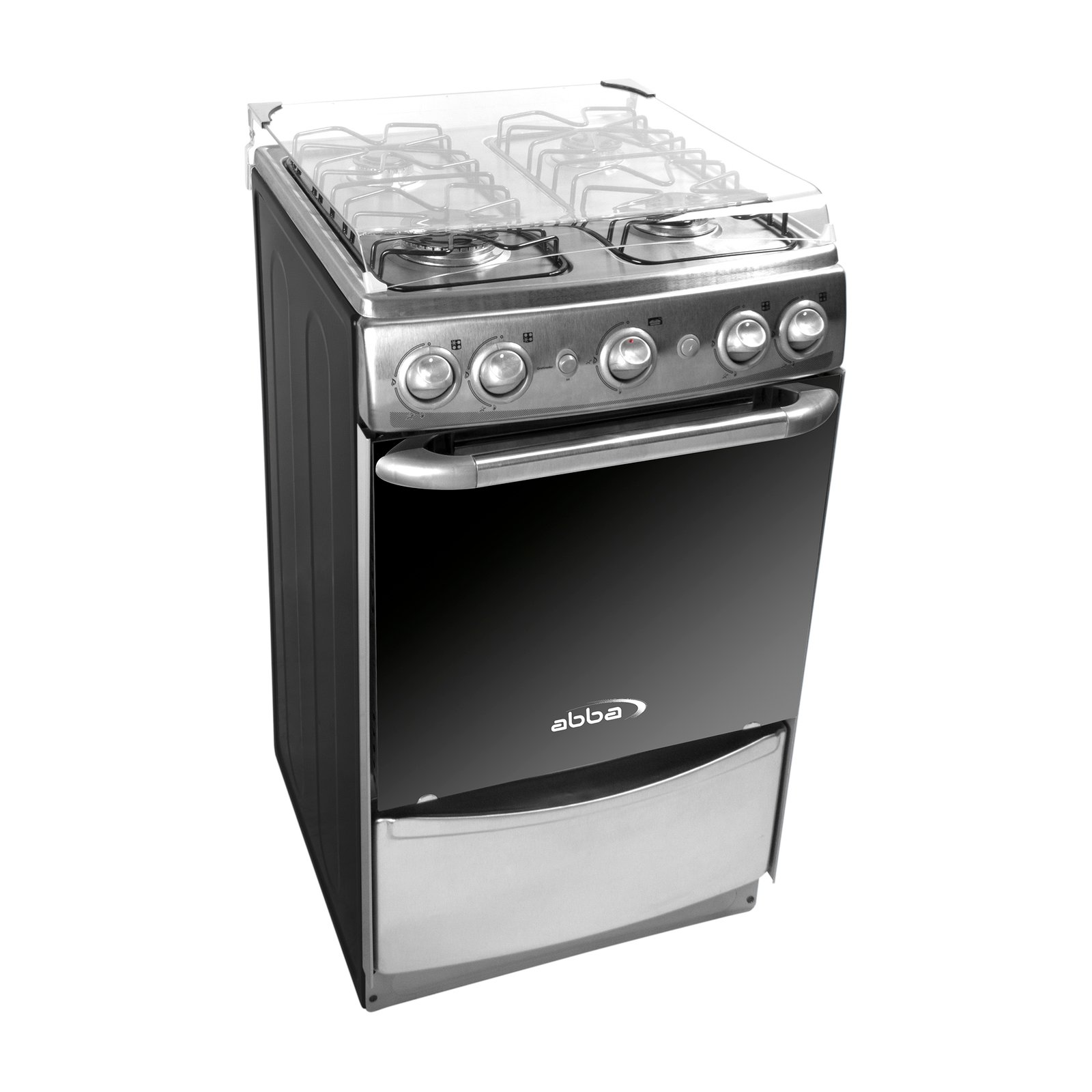 Estufa Master chef Abba 51 centímetros Gas Natural o propano, Quemadores con base en aluminio y tapa en acero porcelanizado: 1 ultrarapido  y 3 rápidos. Funciona a 120V/60Hz. Encendido automático en quemadores y Manual en horno. Mesa sellada con niveles antiderrame para fácil limpieza, en acero inoxidable 430. Parrillas superiores en alambrón porcelanizado. Frente en acero inoxidable. la puerta del horno en vidrio espejo aporta visibilidad al interior  que te permite monitorear tus platillos mientras se cocinan. 2 Parrillas en alambrón porcelanizado, horno con aislamiento térmico lo cual evita perdidas de calor al interior del horno, generando menor consumo de energía, espacioso y eficiente, permite hornear con resultados profesionales, operado por termostato (con protección termoeléctrica), con luz interior (bombillo de 25W), gratinador eléctrico de 1000W a 120 V/60 Hz con sensor térmico que evita el sobrecalentamiento del producto, Perillas de estufa con diseño ergonómico.